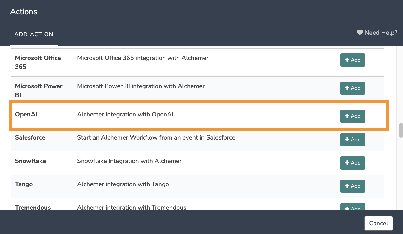2. Click Add Action and select Integrations > OpenAI: Ask AI-Generated Follow-Up Question