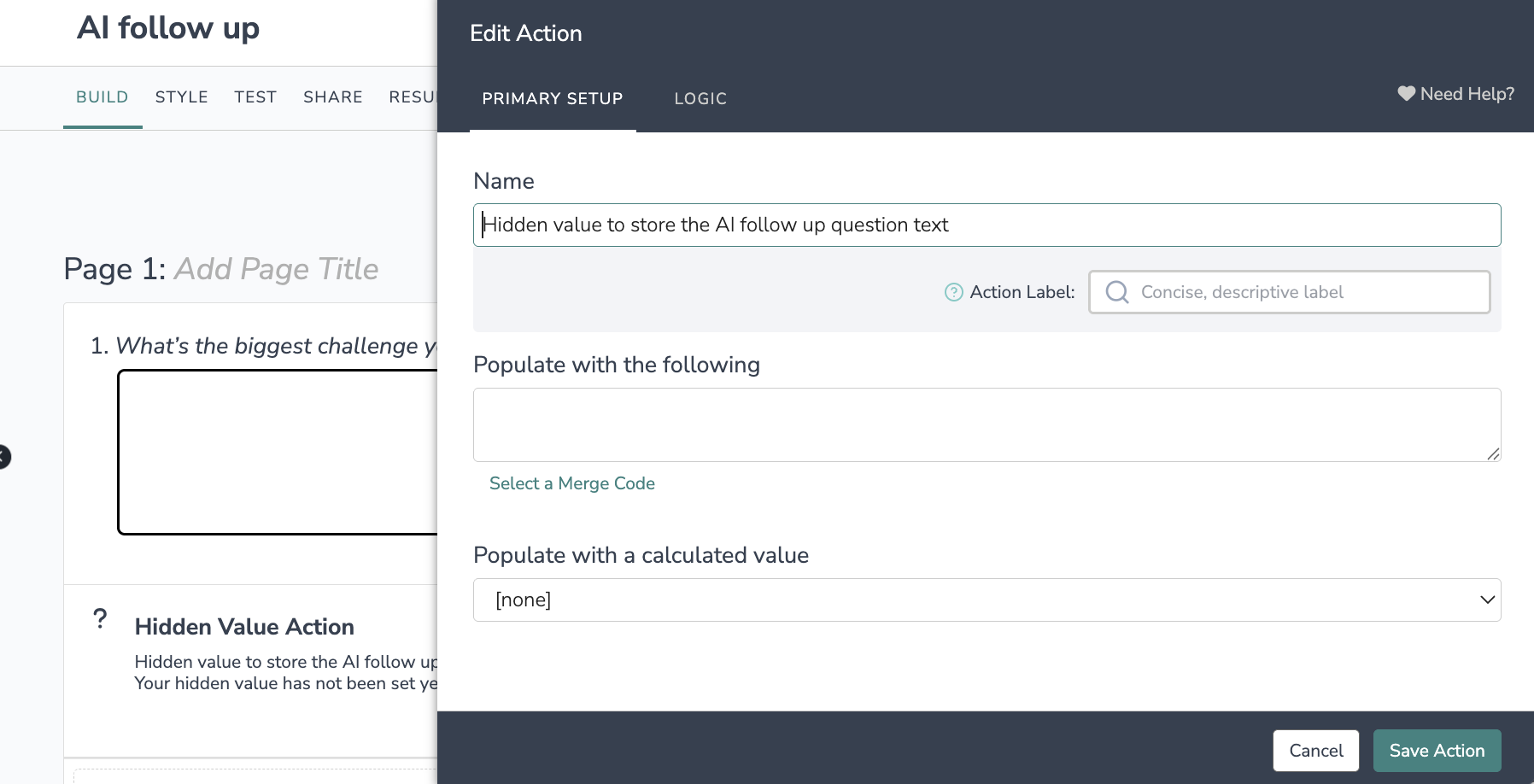4. Configure the action to store the response (follow-up question text) in a Hidden Value.