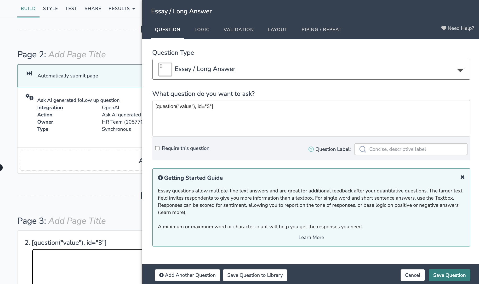The Ask AI-Generated Follow-Up Question integration works by taking a specific question and its answer in your survey, sending it to OpenAI, and returning a personalized follow-up question. You can then use that AI-generated question text in your survey to prompt more detailed responses.