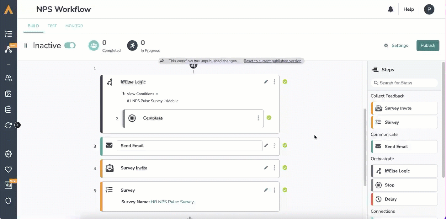 - A Delay Step cannot be placed before a Survey Listener or Share Link initiator.