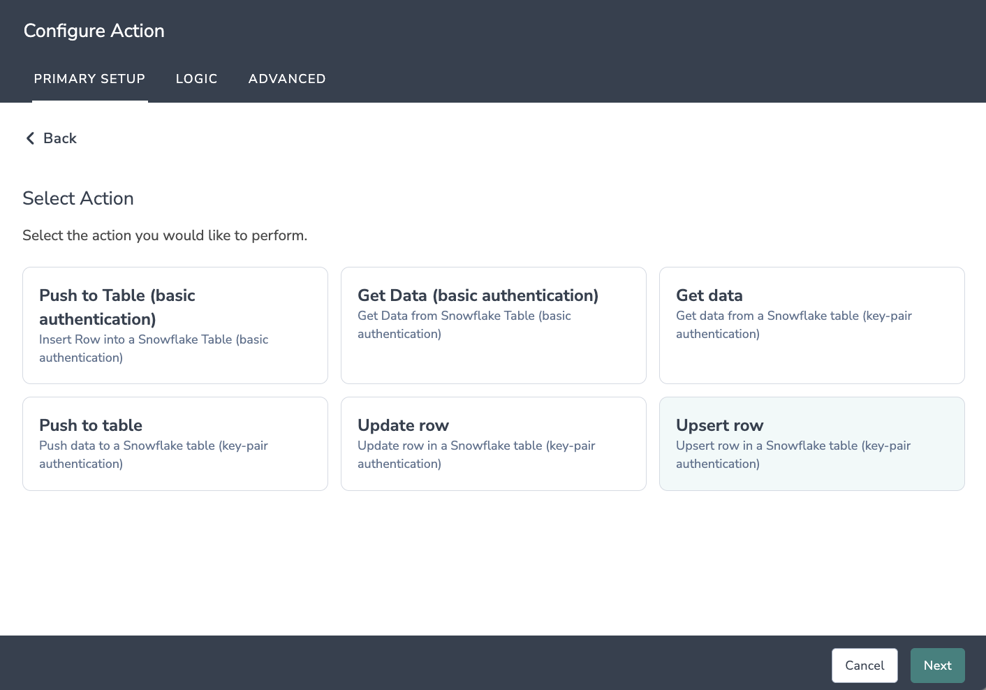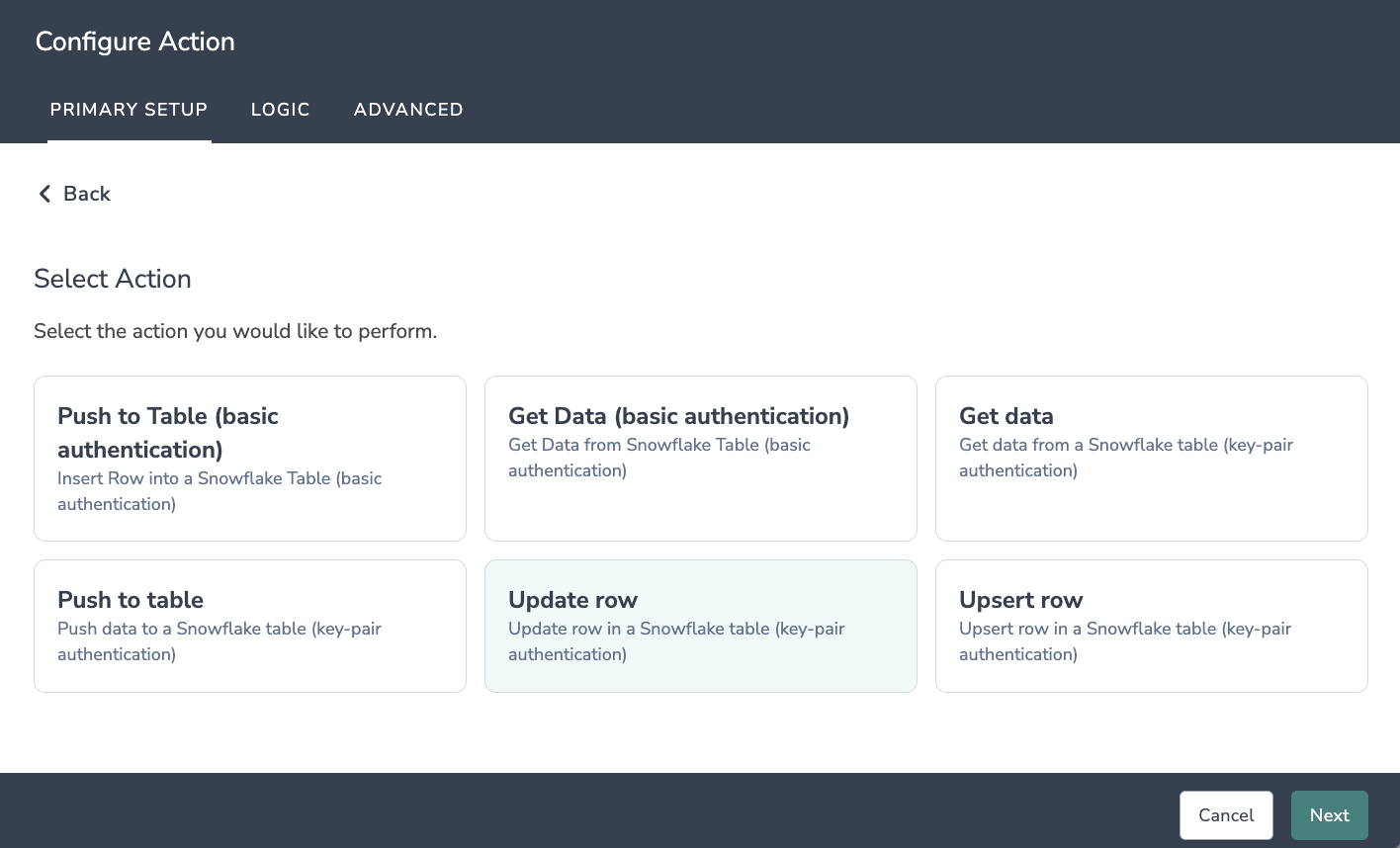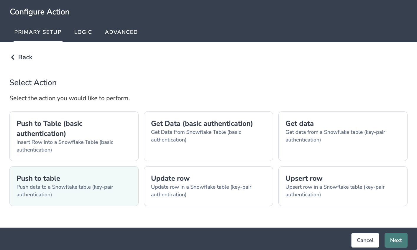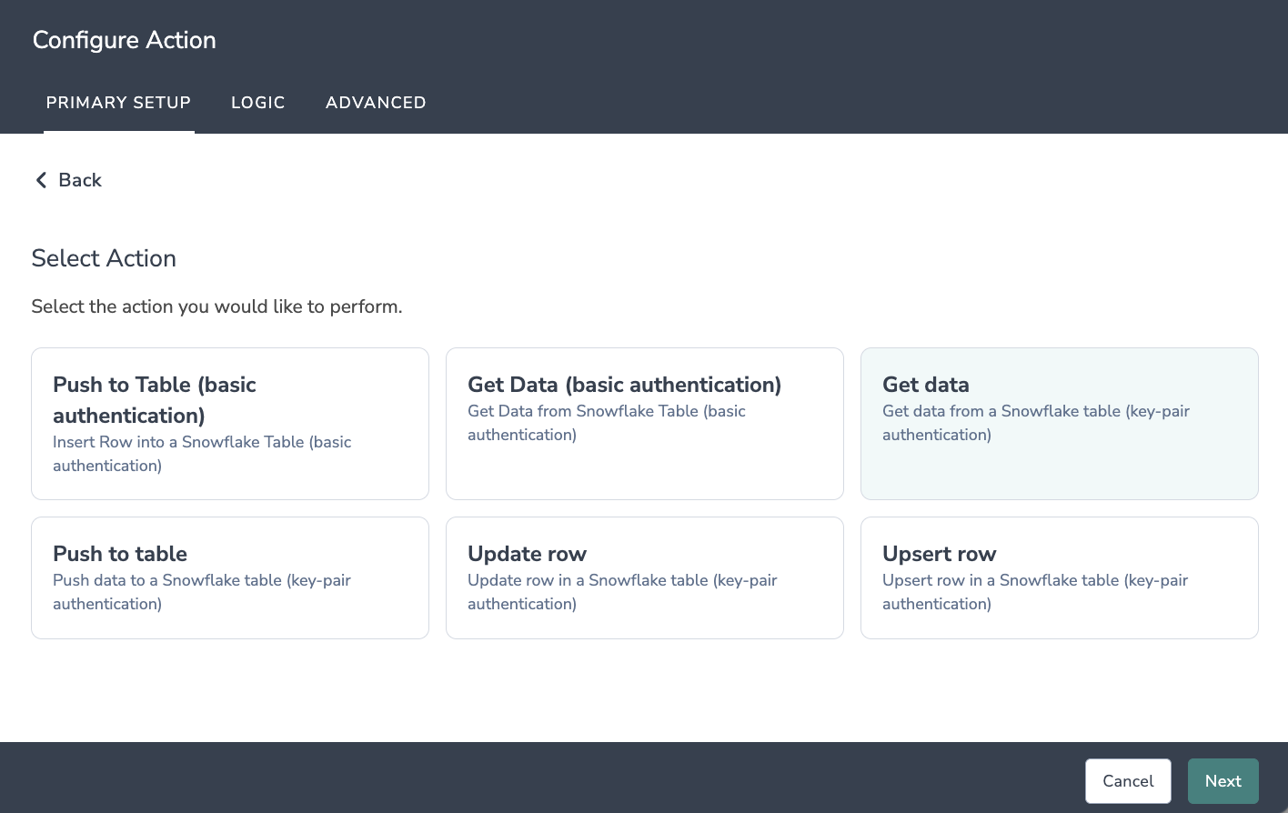 Click Add Action and select Snowflake (Key-Pair) integration.