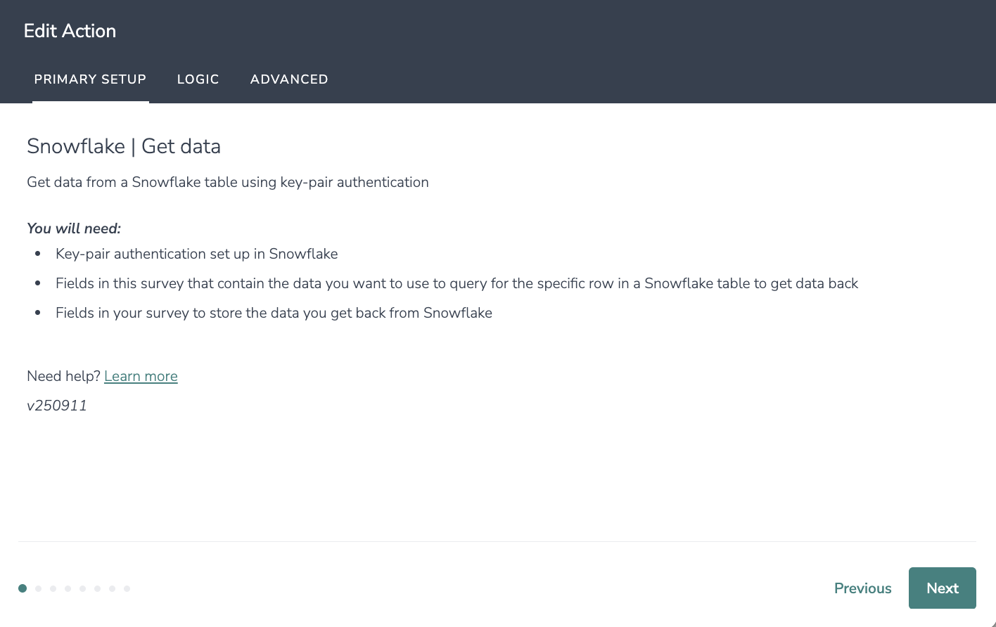 - Fields in the survey that contain the data you want to use to query for the specific row in a Snowflake table to get data back.