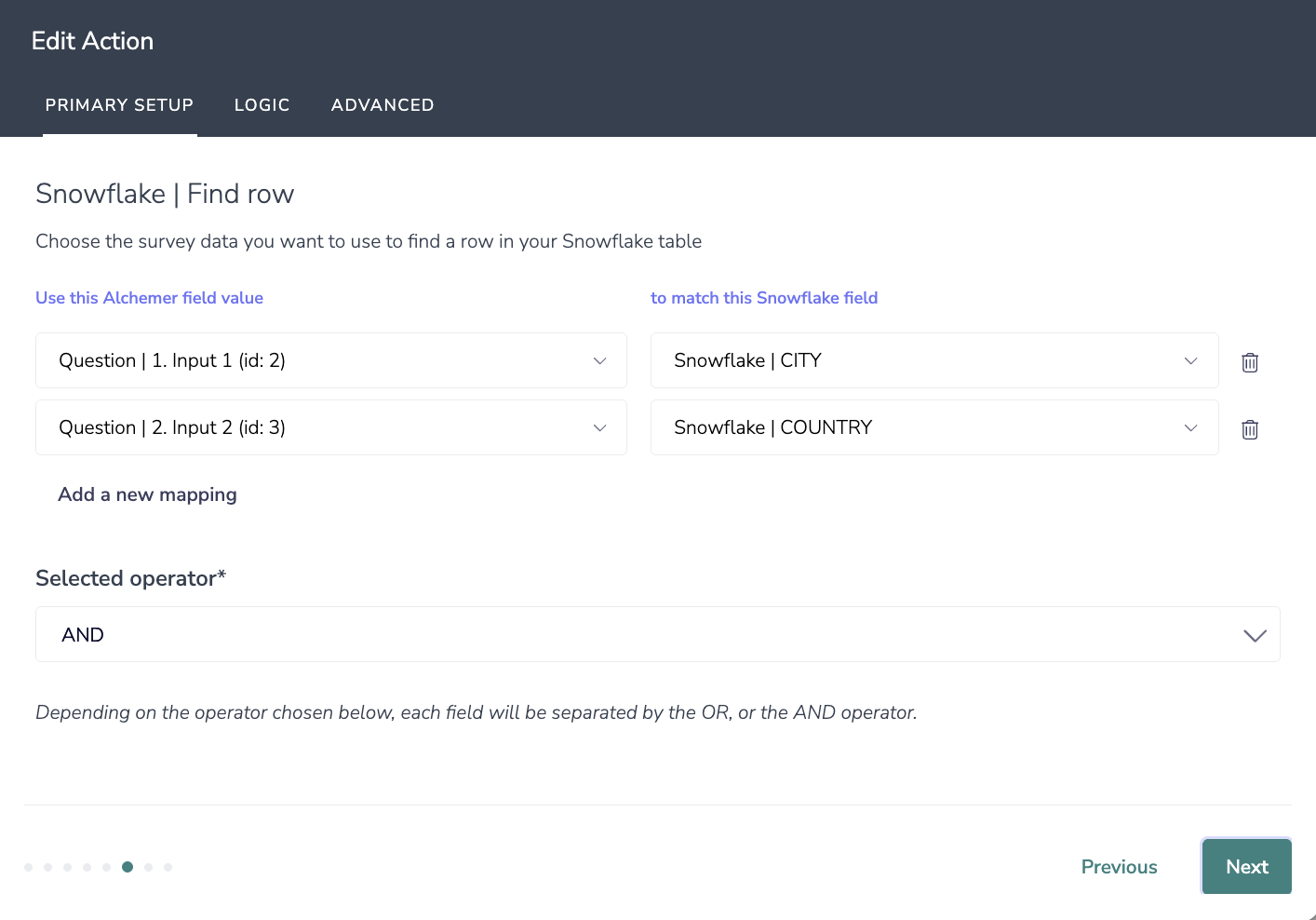- Fields in the survey that contain the data you want to use to find a row in your Snowflake table