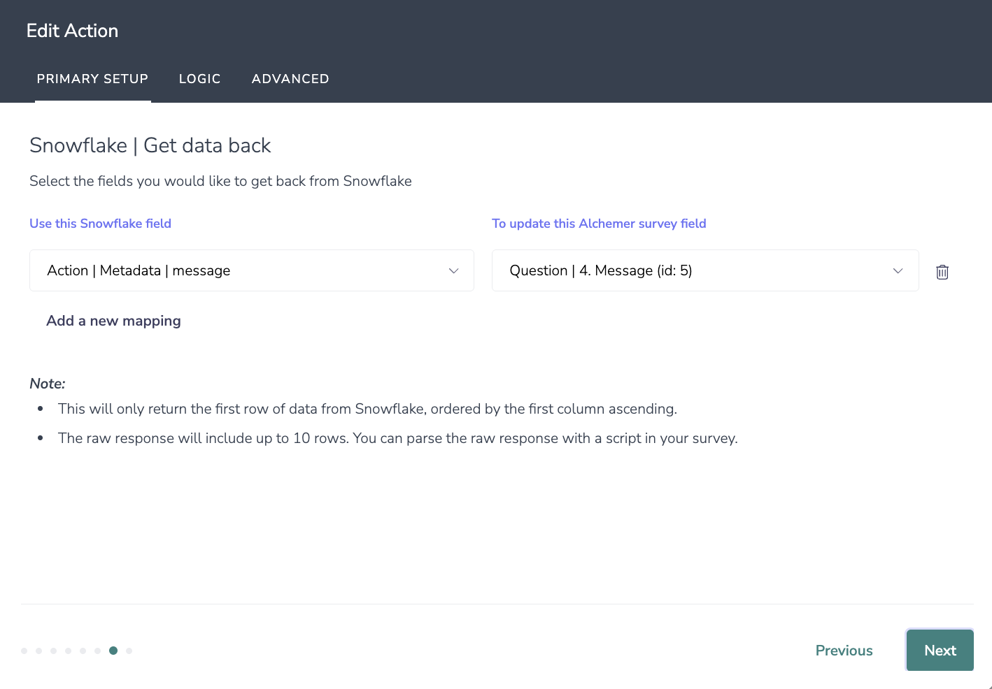 6. Choose the survey data you want to use to find a row in your Snowflake table.