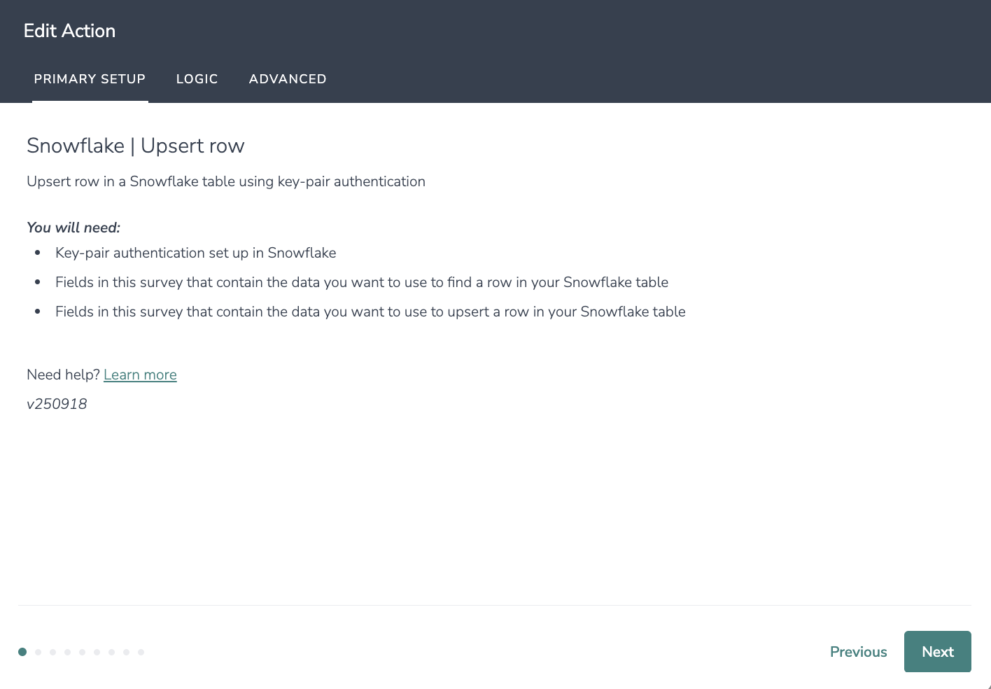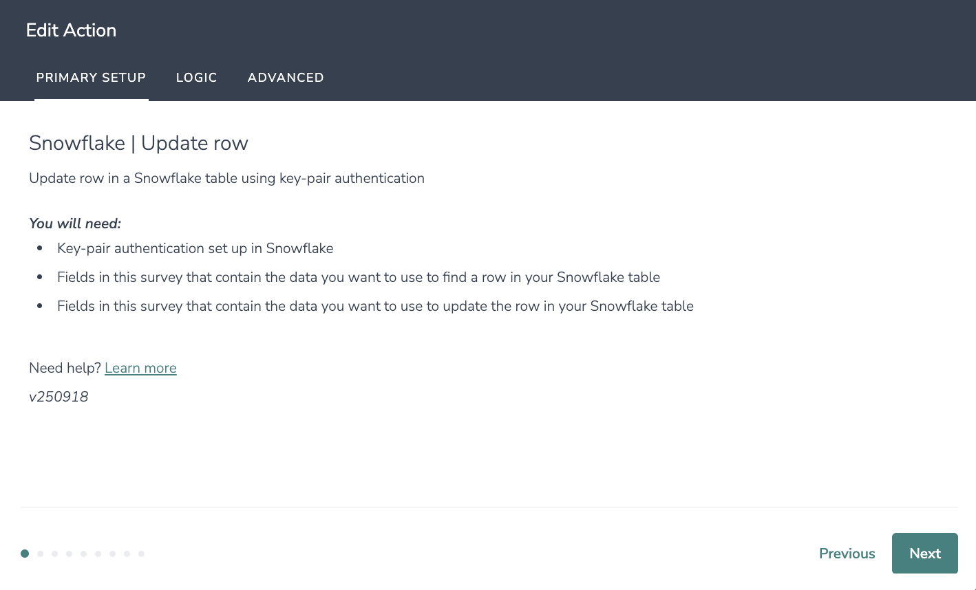 - Fields in your survey that contain the data you want to use to upsert a row in your Snowflake table