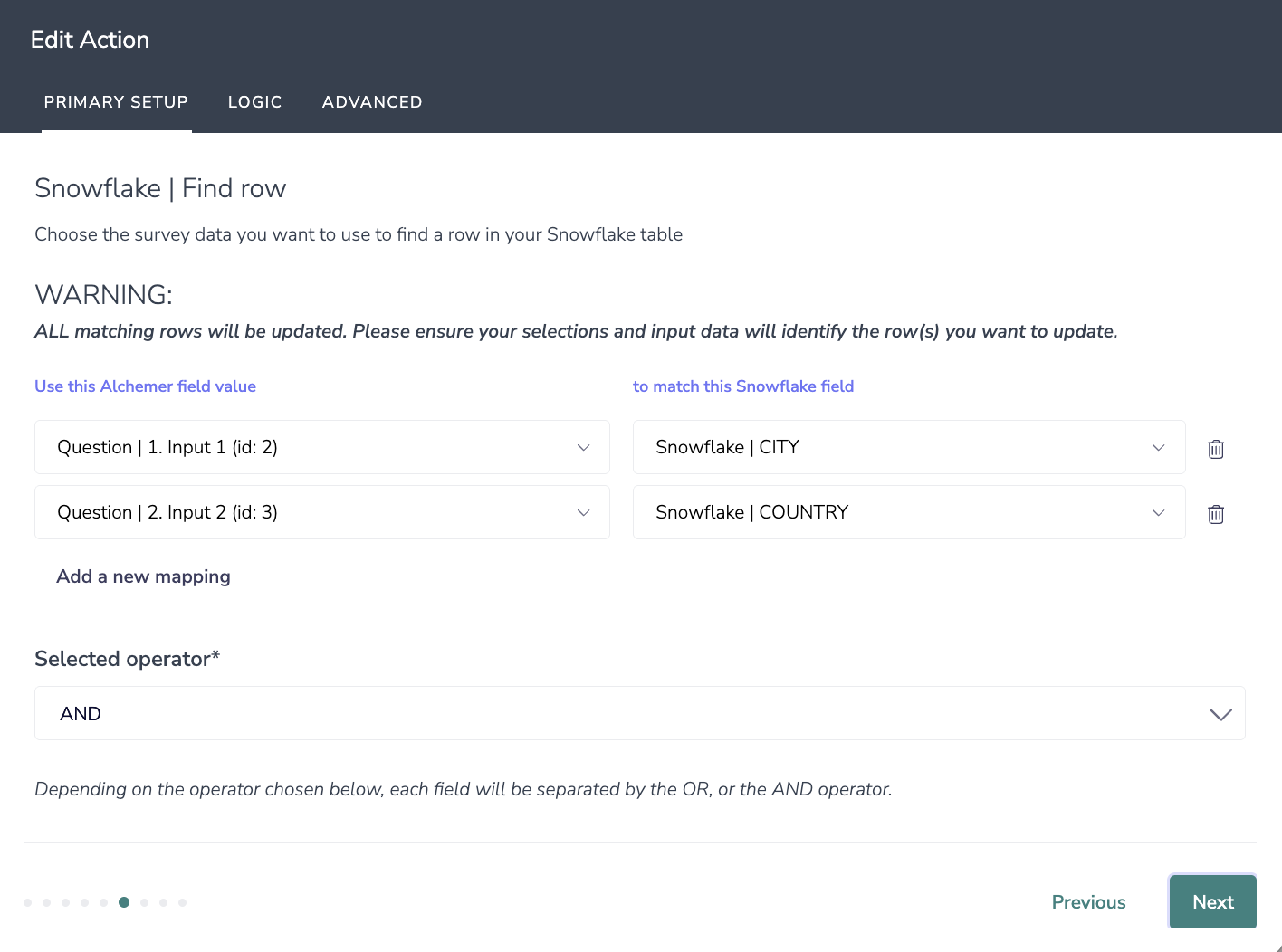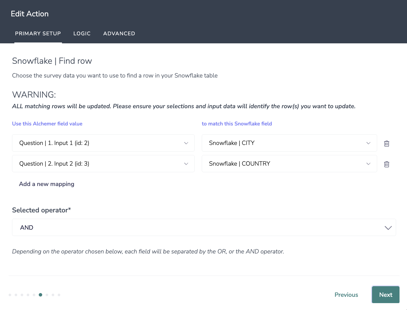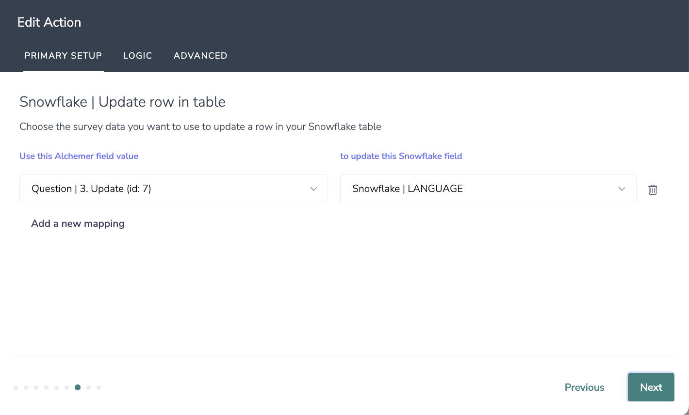 - Fields in your survey that contain the data you want to use to update the row in your Snowflake table