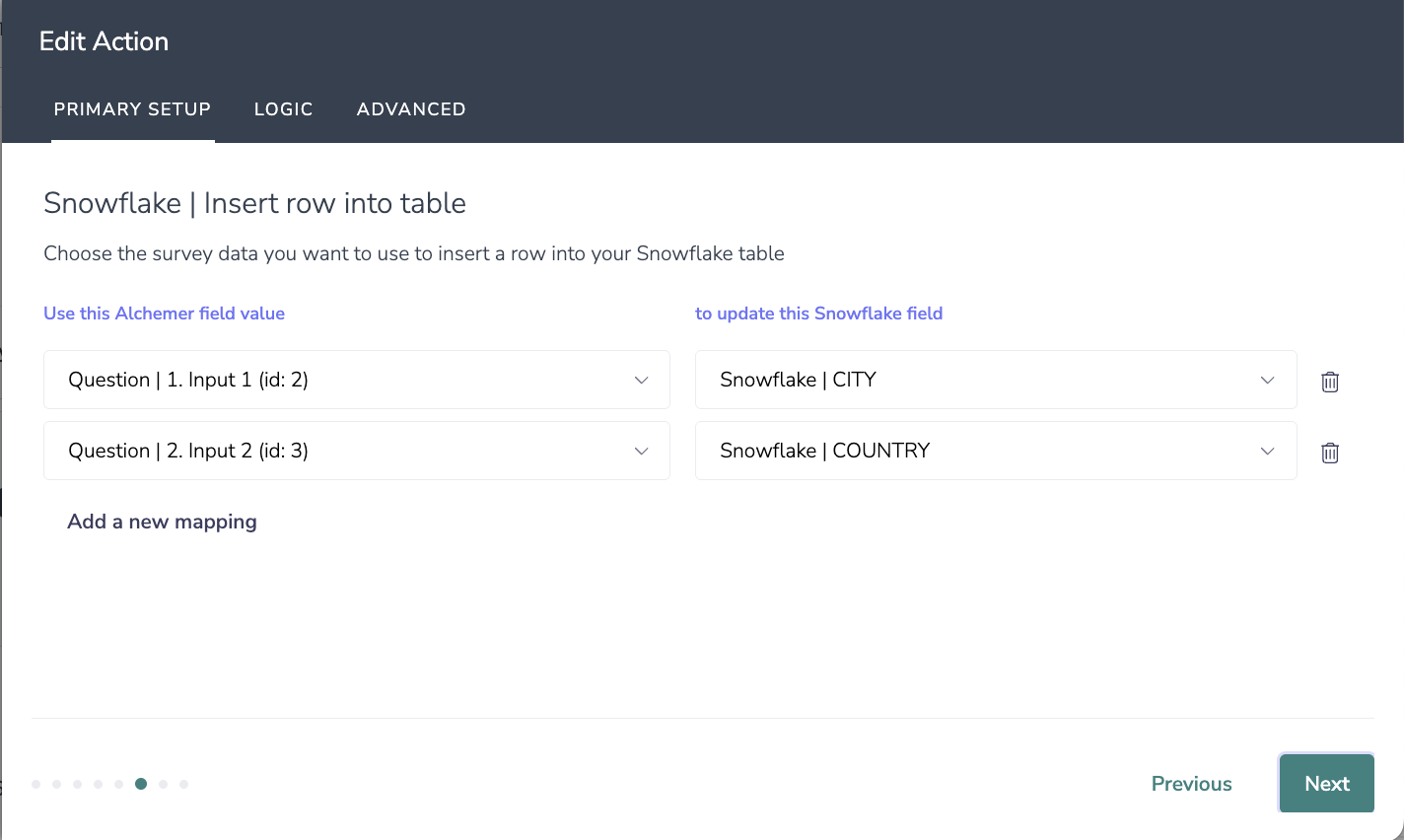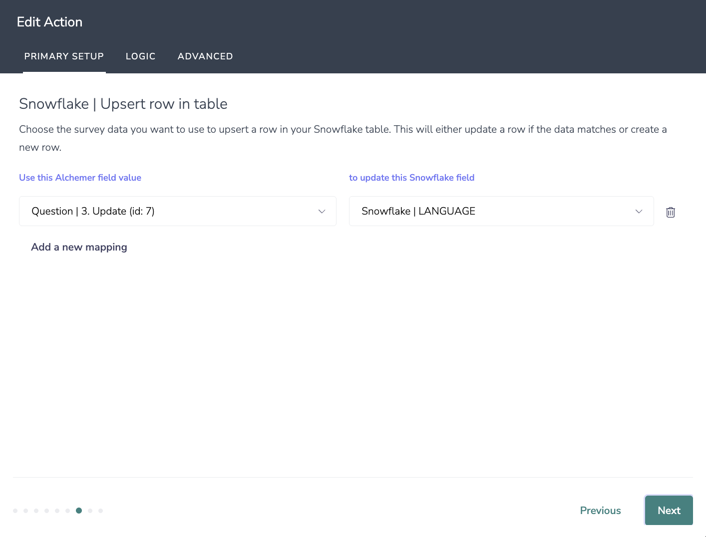 7. Choose the survey data you want to use to upsert a row in your Snowflake table. This will either update a row if the data matches or create a new row.