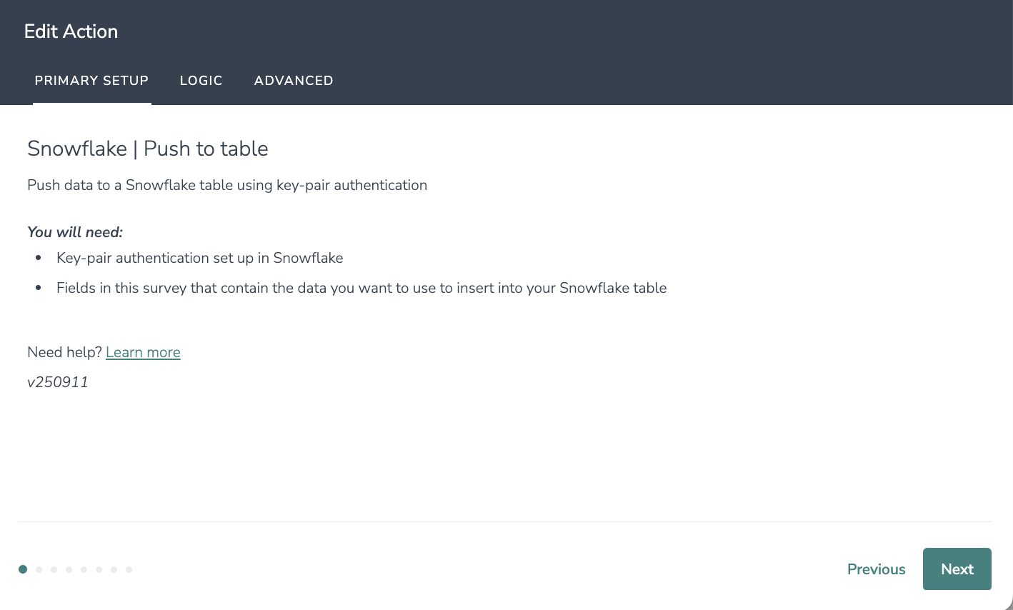 If you are not using key-pair, please refer to our Alchemer Survey Snowflake Integration or our Alchemer Workflow Snowflake Integration help docs.