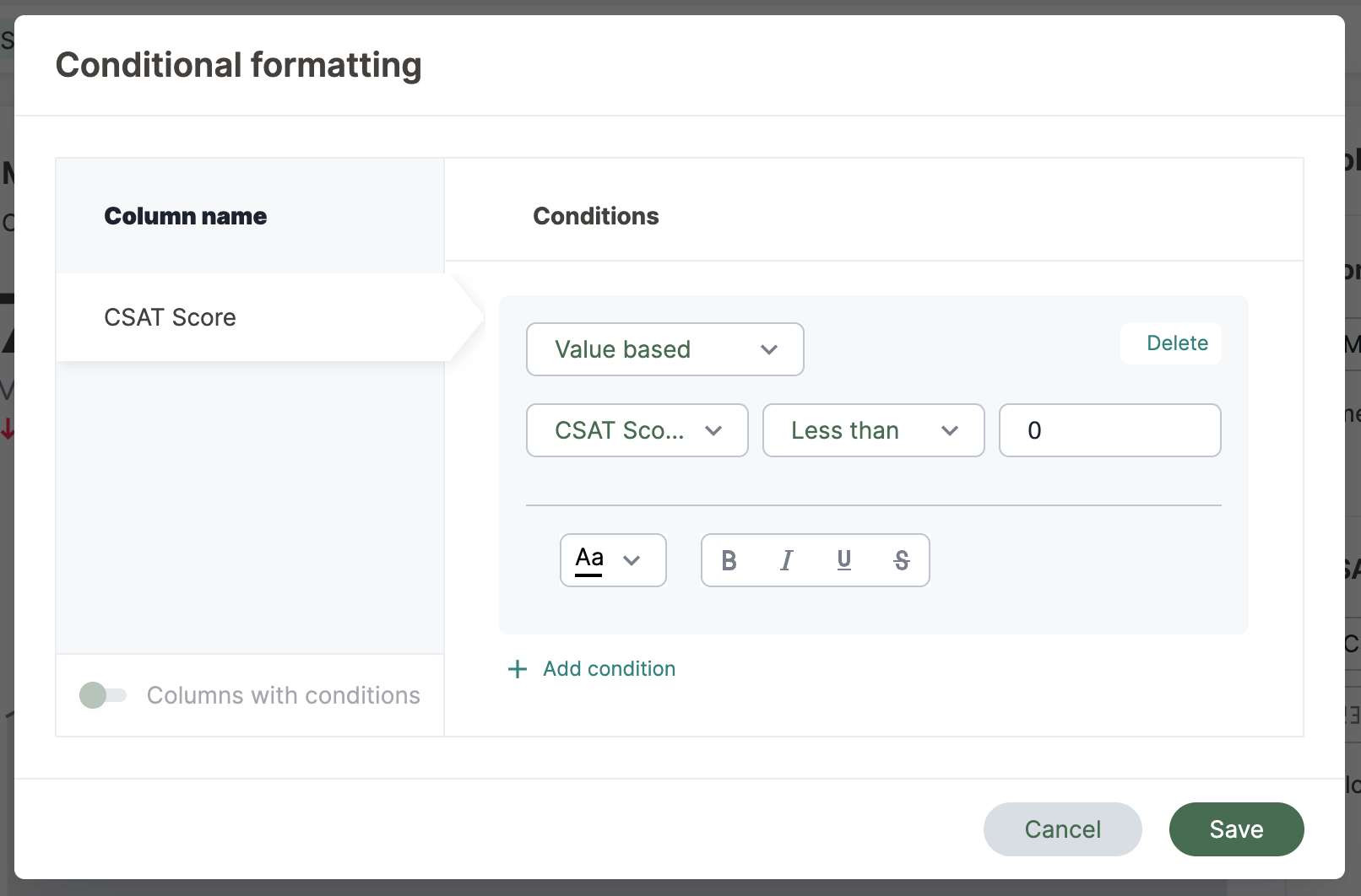 You can add visual cues for KPIs or threshold metrics to easily show where you are falling short or exceeding targets. These visual cues are called conditional formatting, which applies color and font formatting to your search result. Add conditional formatting to show the threshold(s) you defined, and the data that falls within them will be shown using the same color.