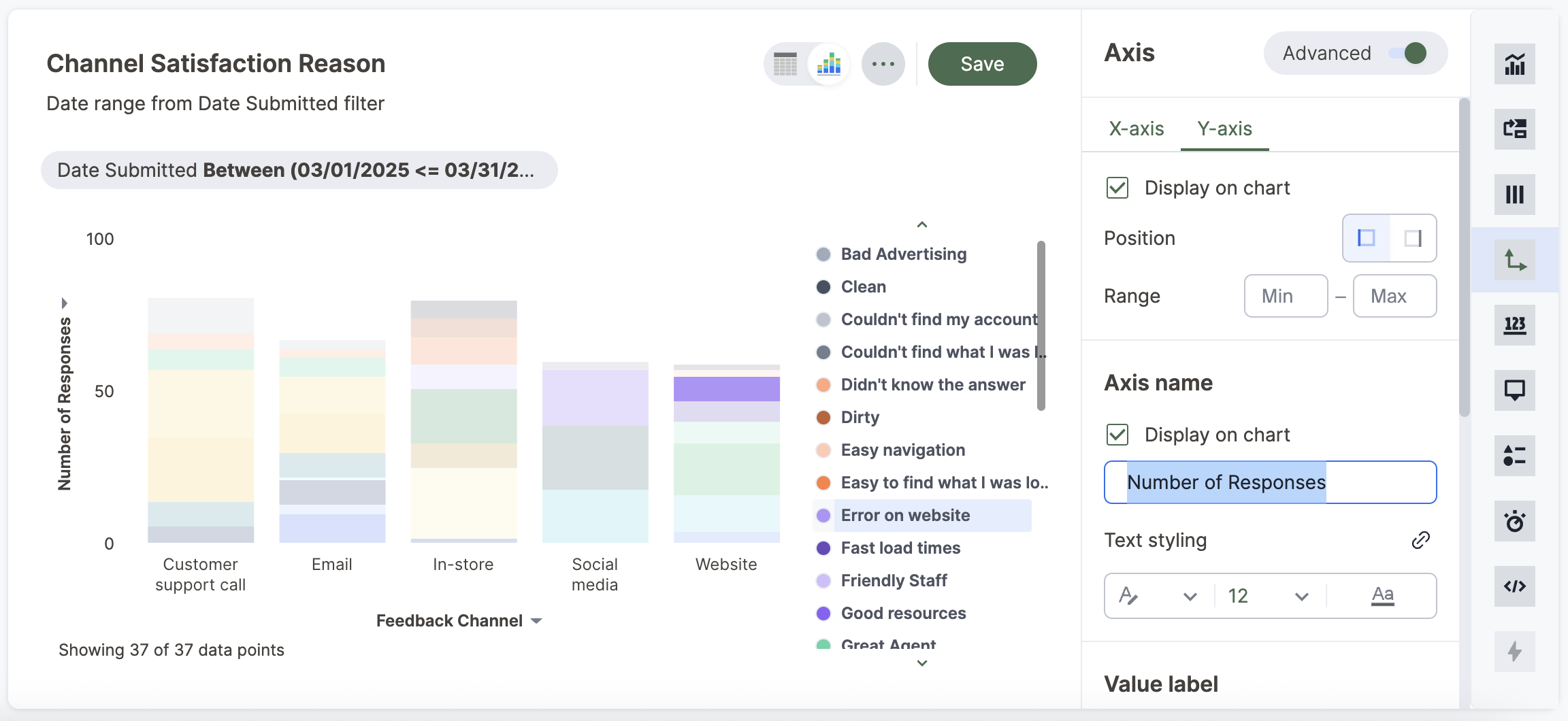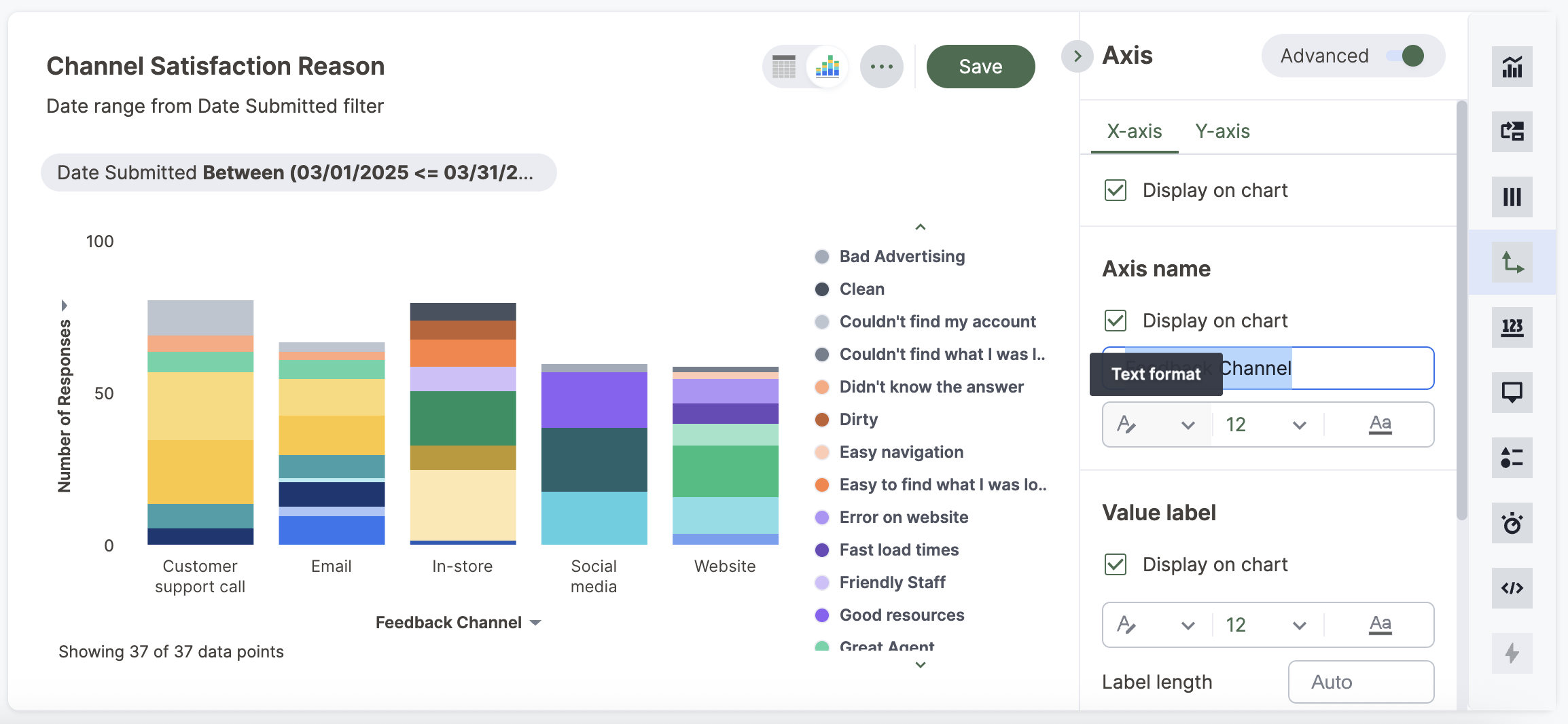 When you perform a search or view and edit a Chart, you can rename the axes on your chart or the columns on your table.