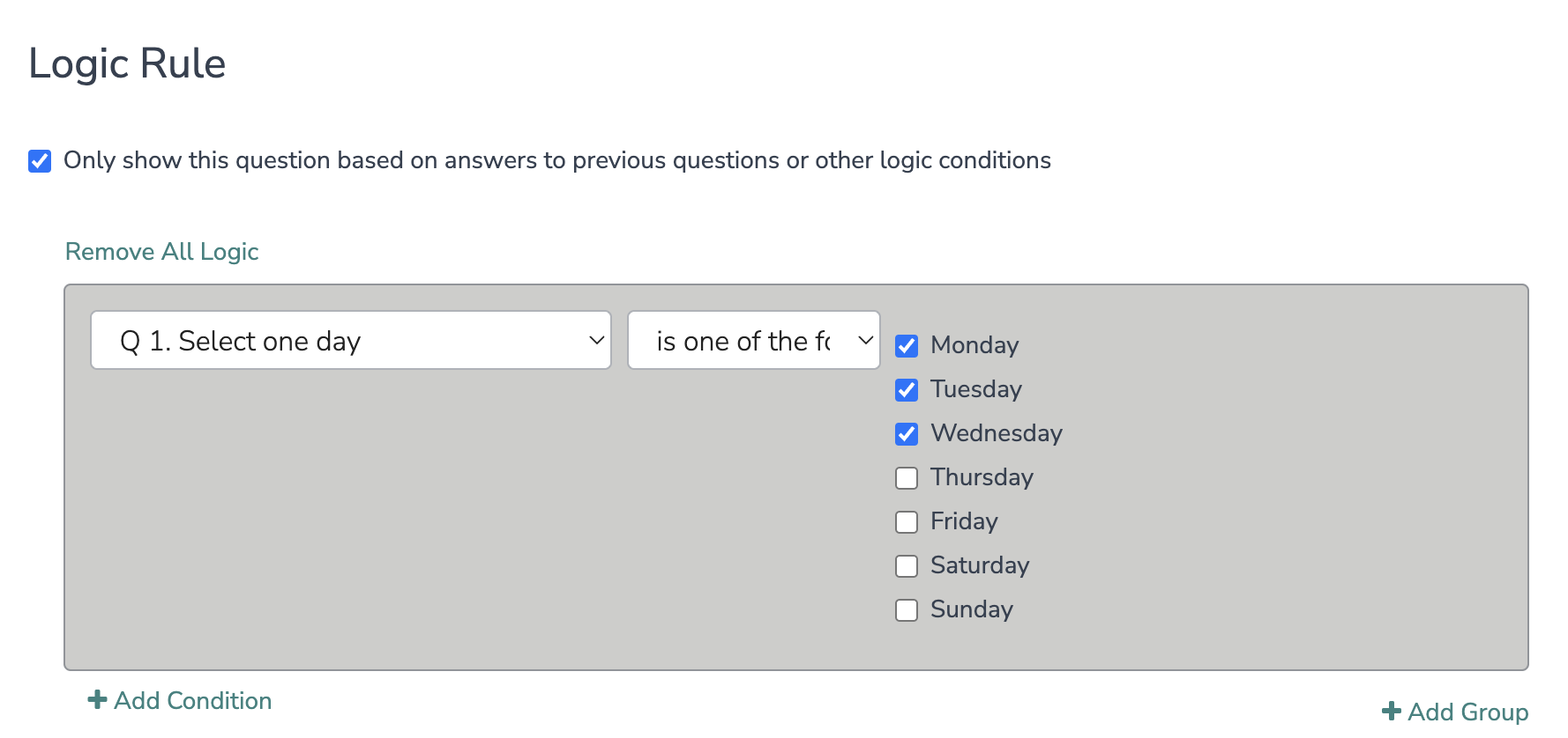 These options correspond to the logic rules in the 'Logic' tab in the question builder.