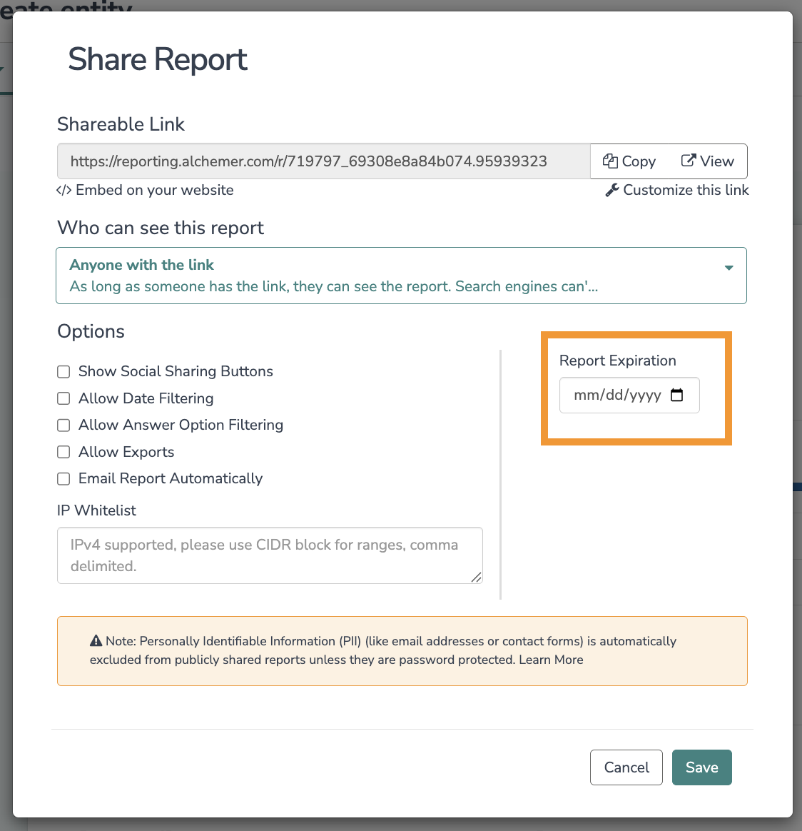 An expiration date can be added to Share Report links to prevent viewers from seeing data beyond a defined time. Access to reports with expiration dates will expire at midnight (according to the time zone set on your account) of the expiration date entered.
