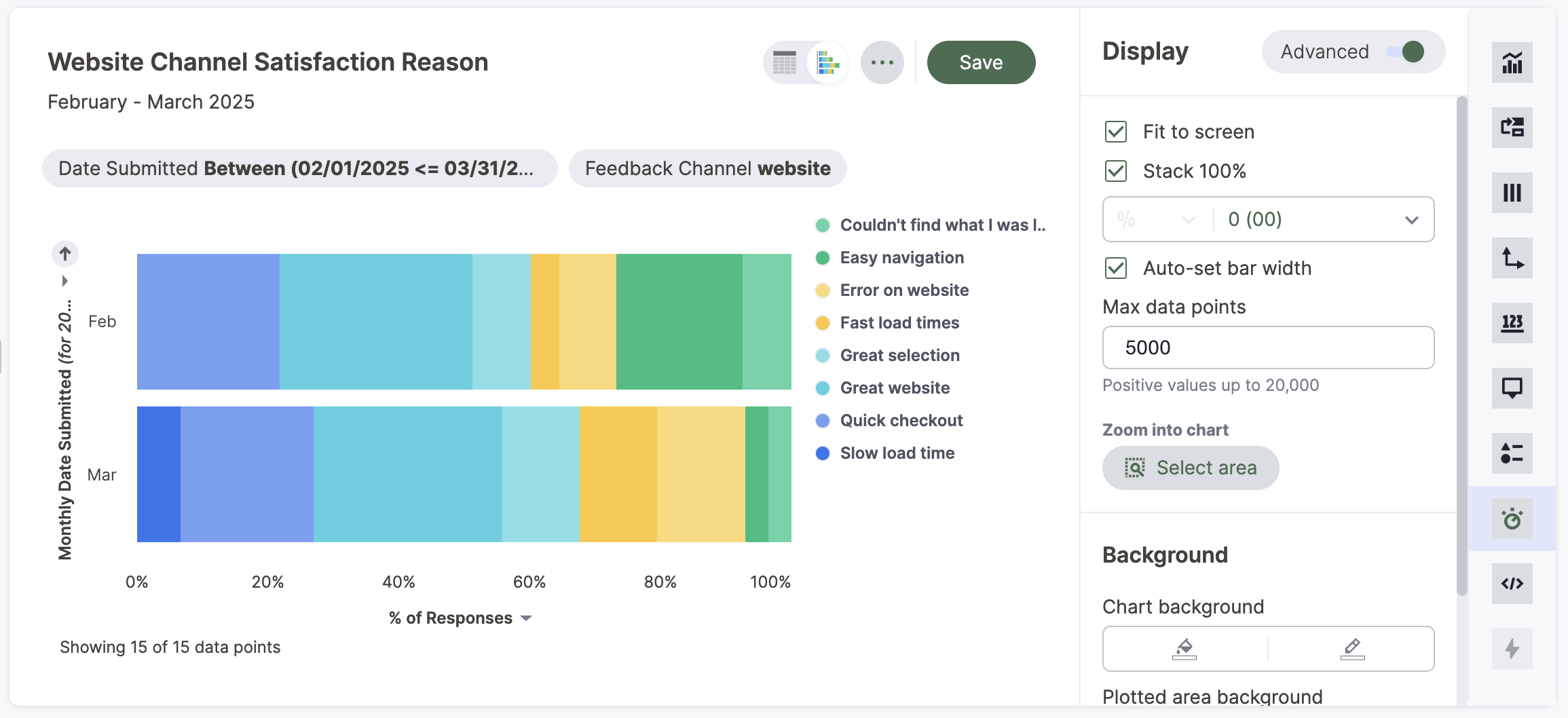 You can also plot the x-axis as a percentage, adding up to 100%. Select the measure or attribute chip that you are using to slice with color. Under Format, toggle Stack 100% on or off. You can also toggle Stack 100% from an axis chip, as in the preceding image. This feature is also available for stacked area and column charts.