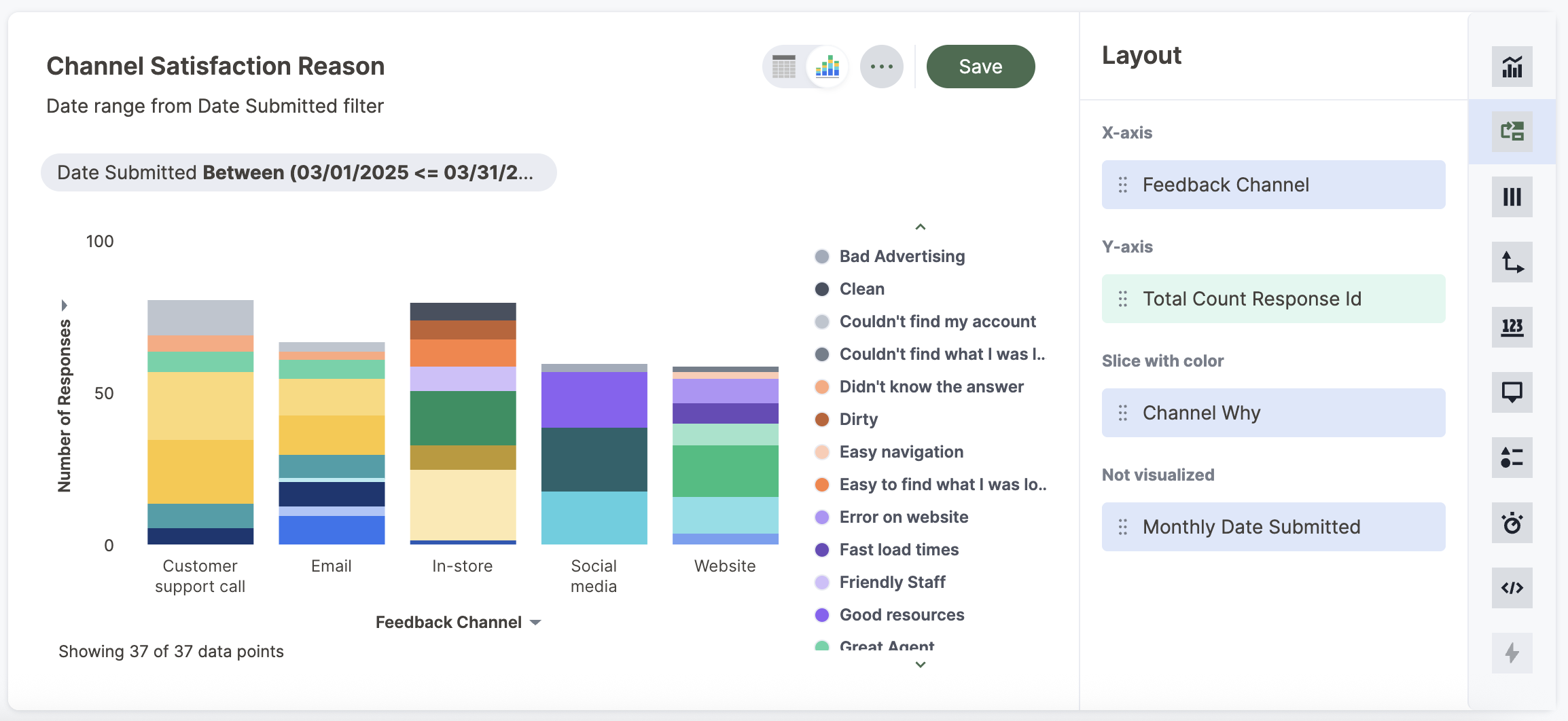 Stacked column charts are typically used when you want to compare aggregated data and the data that it includes together. You can select a configurable axis chip (any axis chip with a >) to show Detail Labels (summaries for each section of each bar) or Total Labels (show the sum of the stacks at the top of each stack).
